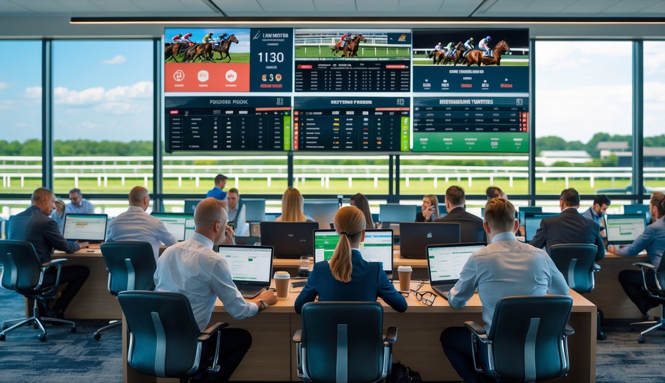 Orang-orang sedang memasang taruhan di agen judi balap kuda dengan layar digital menampilkan informasi balapan kuda di latar belakang.