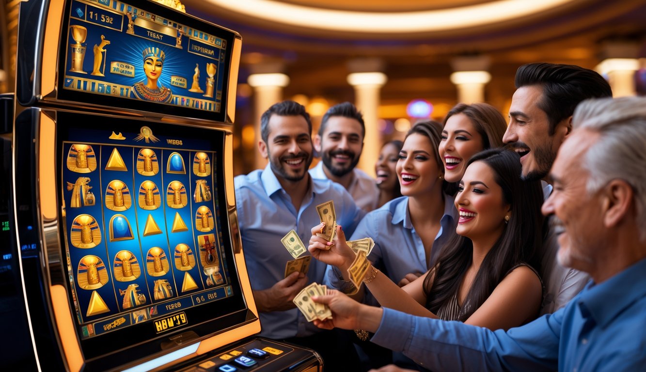 Beberapa orang bermain mesin slot dengan tema Mesir kuno di dalam kasino yang mewah dan terang.