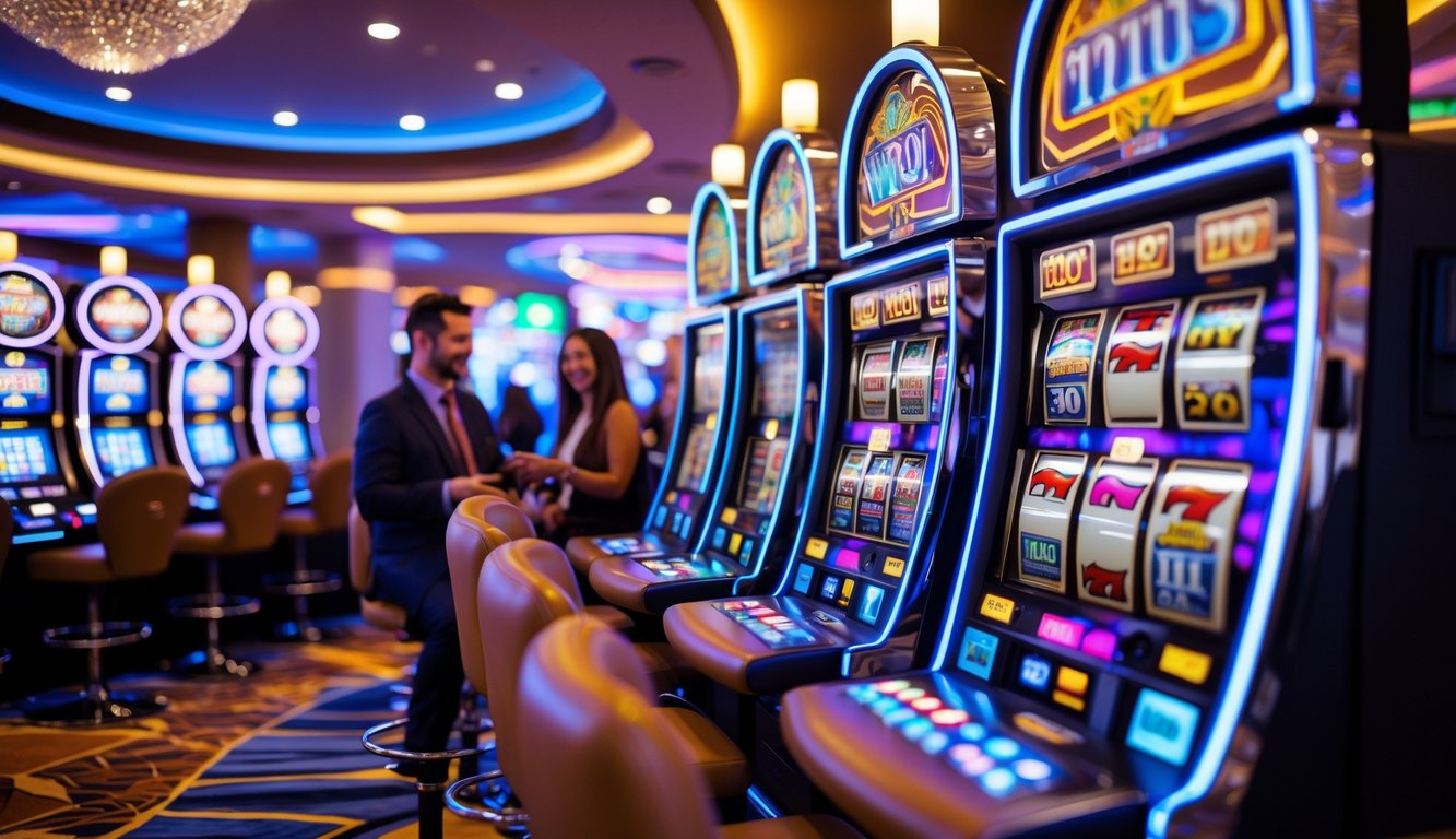 Area mesin slot di kasino dengan beberapa orang yang sedang bermain dan suasana yang ramai serta cerah.