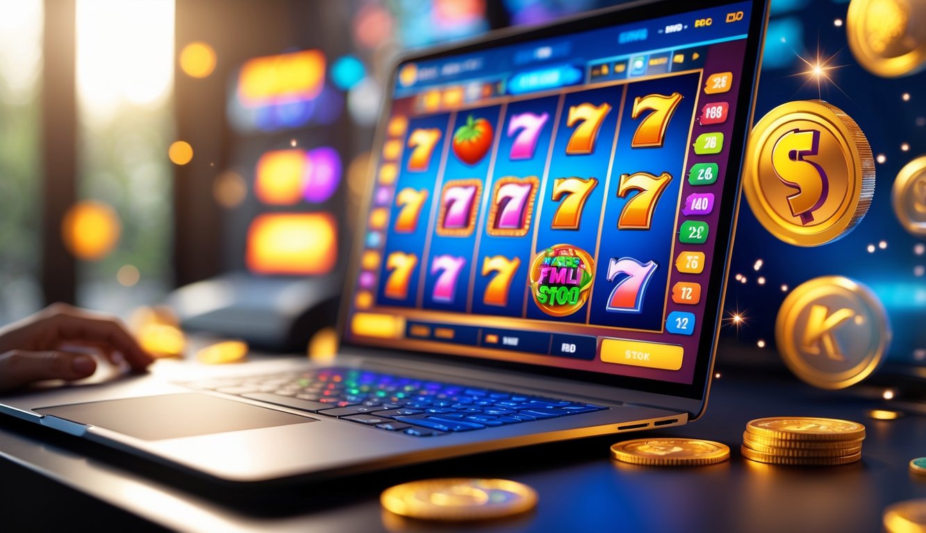 Layar komputer menampilkan permainan slot online dengan gulungan warna-warni dan simbol buah, dikelilingi koin dan efek cahaya yang menunjukkan kemenangan.